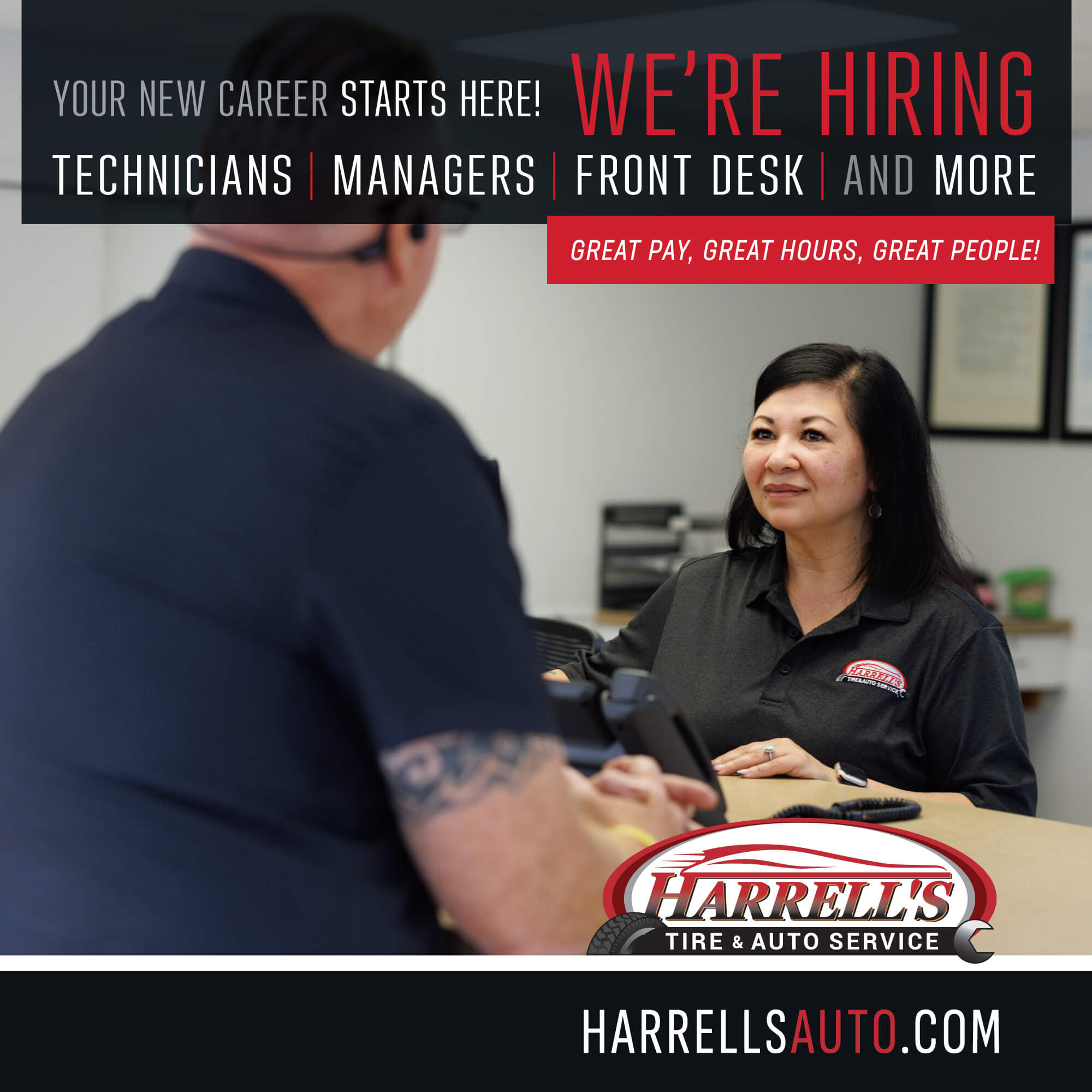 We are hiring for all positions. We offer 401K, health, dental and vision insurance benefits. If you are ready to start a new career with great pay, great hours, and great people, then Harrell’s Tire & Auto Service is the place for you! Please email your application to [email protected].